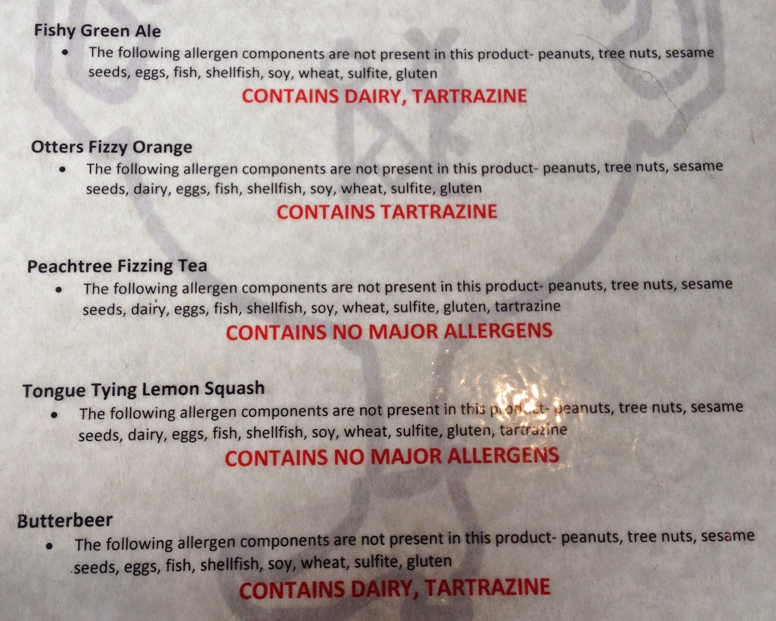 - Wizard’s Brew and Dragon Scale (alcoholic): exclusively-brewed beer that is for wizarding folks over 21. Contains wheat and gluten, but other allergens unknown.